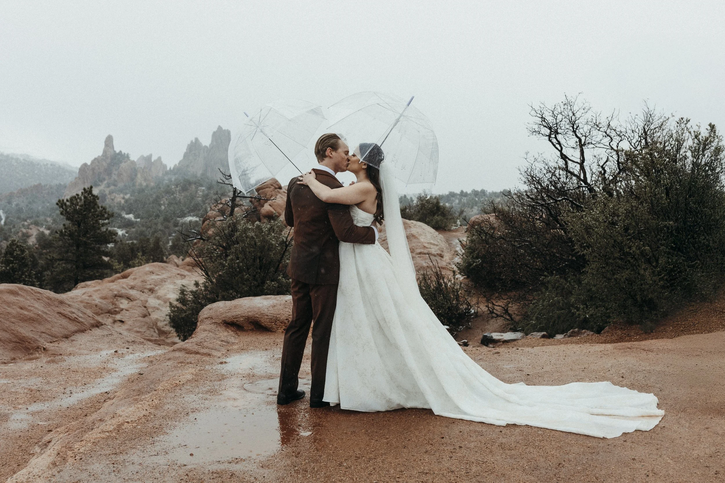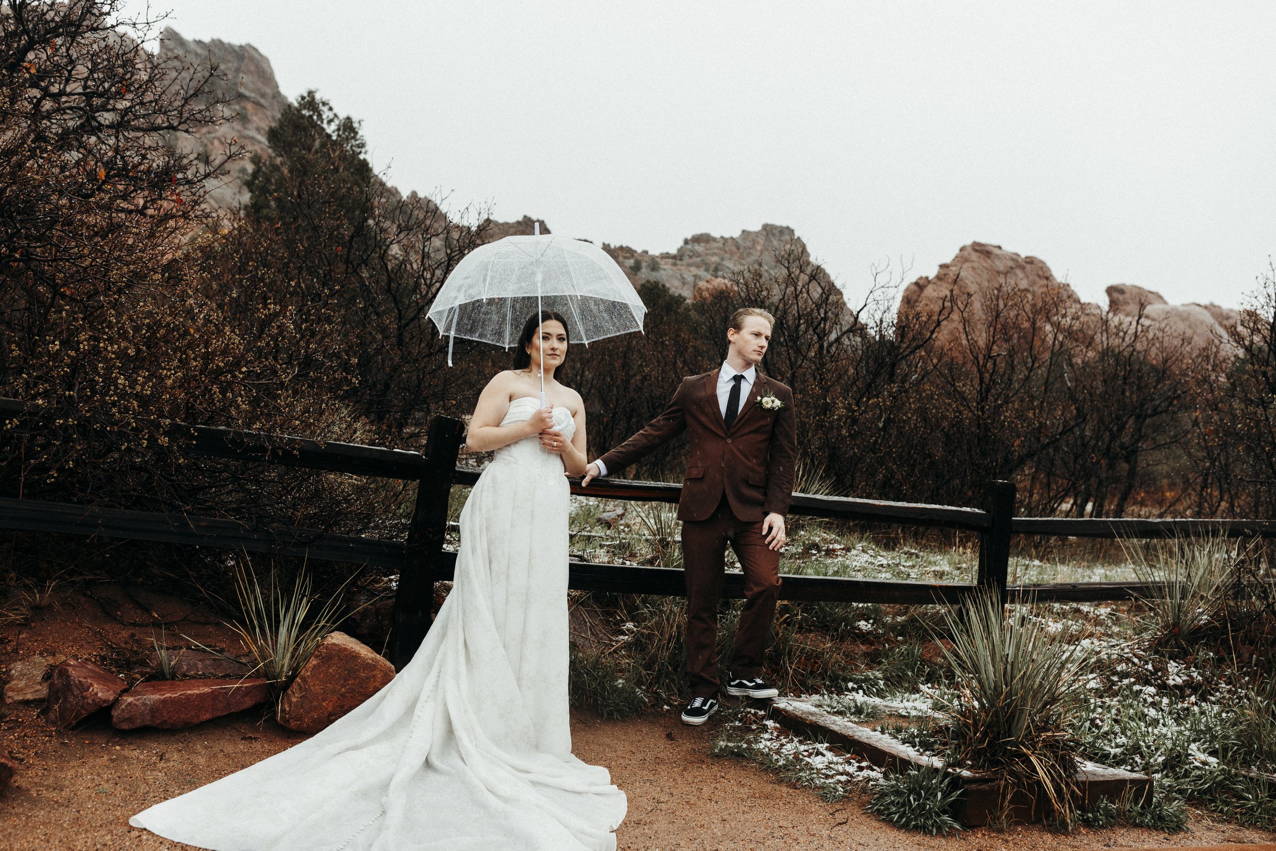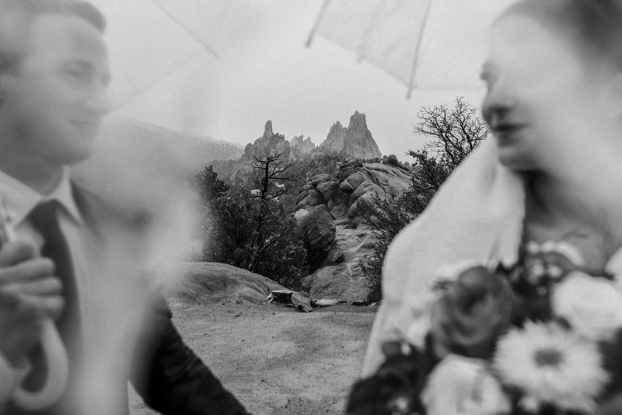 Beth & Alec's rainy Garden of the God's elopement was, as Alec so eloquently put it: definitely memorable. I've shot in Colorado numerous times. I'm well aware of the vastly changing weather, and when I saw that the forecast called for rain and snow the afternoon of their ceremony, I was none too concerned. On a previous trip to Colorado I had inadvertently driven straight into a snow squall. A mere half hour later, while having a full break down in gas station parking lot, the weather was calm and clear. After that experience, not much frightened me, least of all some rain. So I packed my gear and headed up the mountain on that chilly day in May, thinking we would shoot between rain showers. Boy, was I wrong. When I arrived it was heavily snowing, and once the ceremony begin the snow changed over into a cold, moderate rainfall. While the rain did become lighter as the afternoon progressed, it never stopped raining. Not once. This elopement ended up producing one of the most challenging weather circumstances I've endured to date. And yet, the photos turned out so hauntingly lovely.