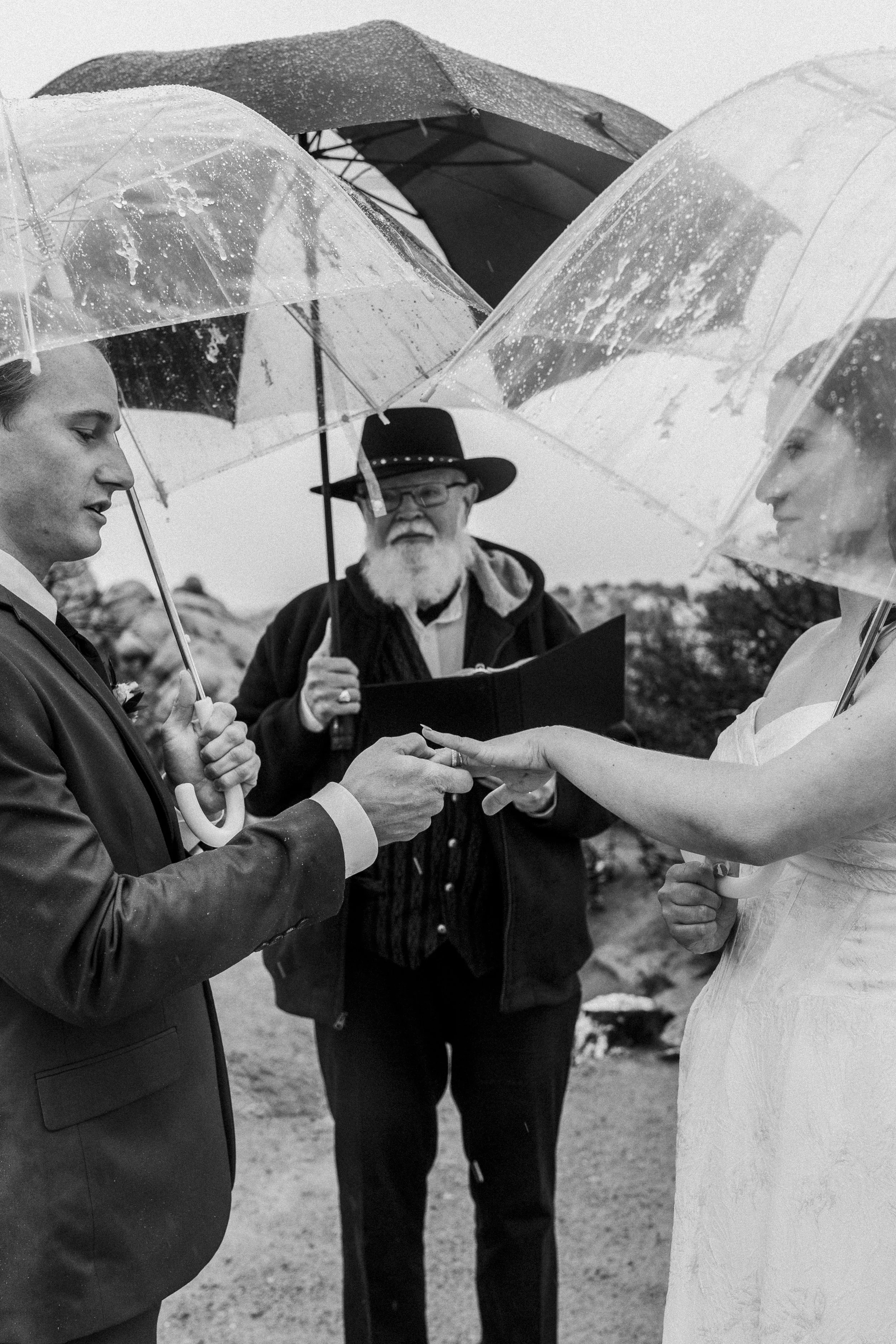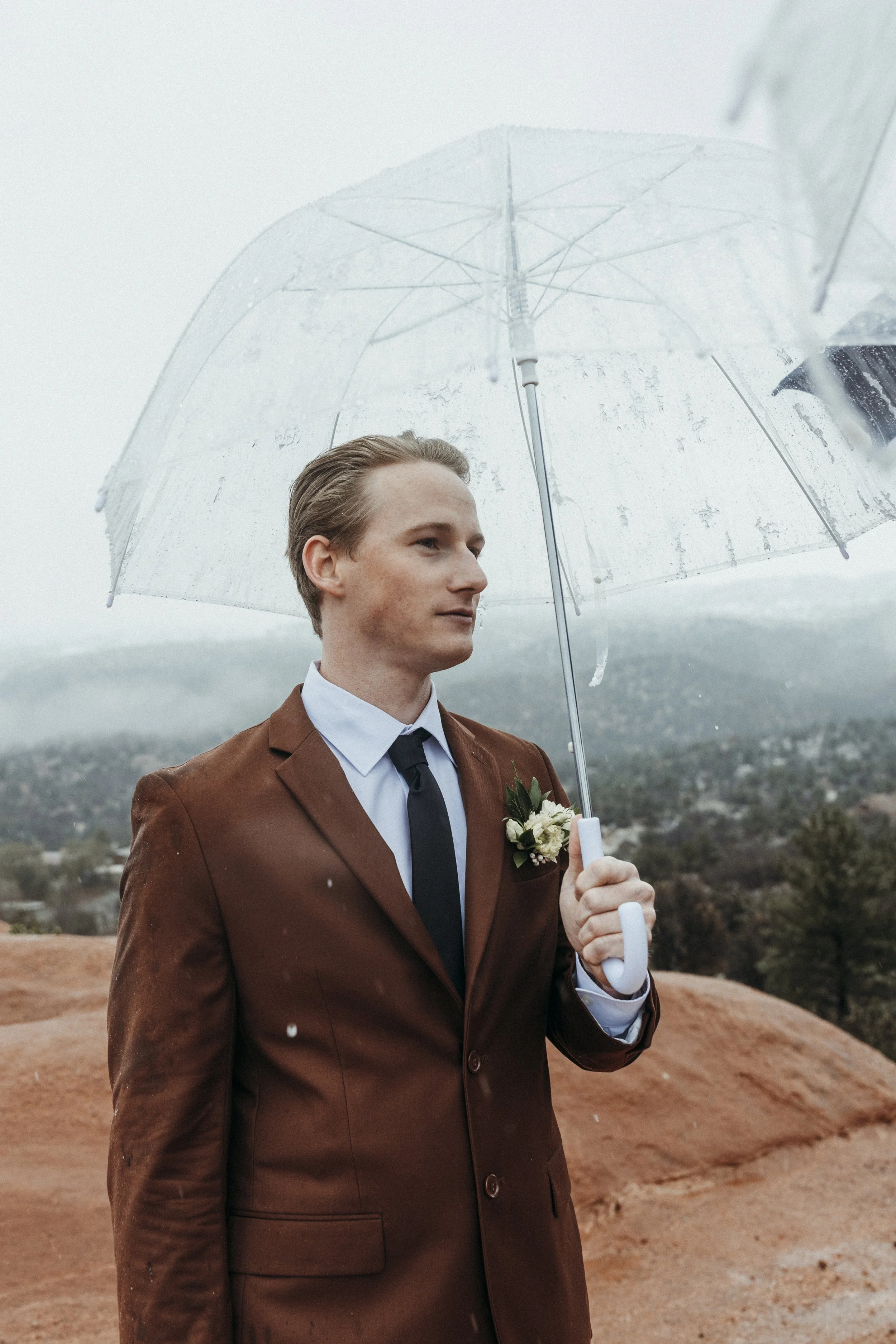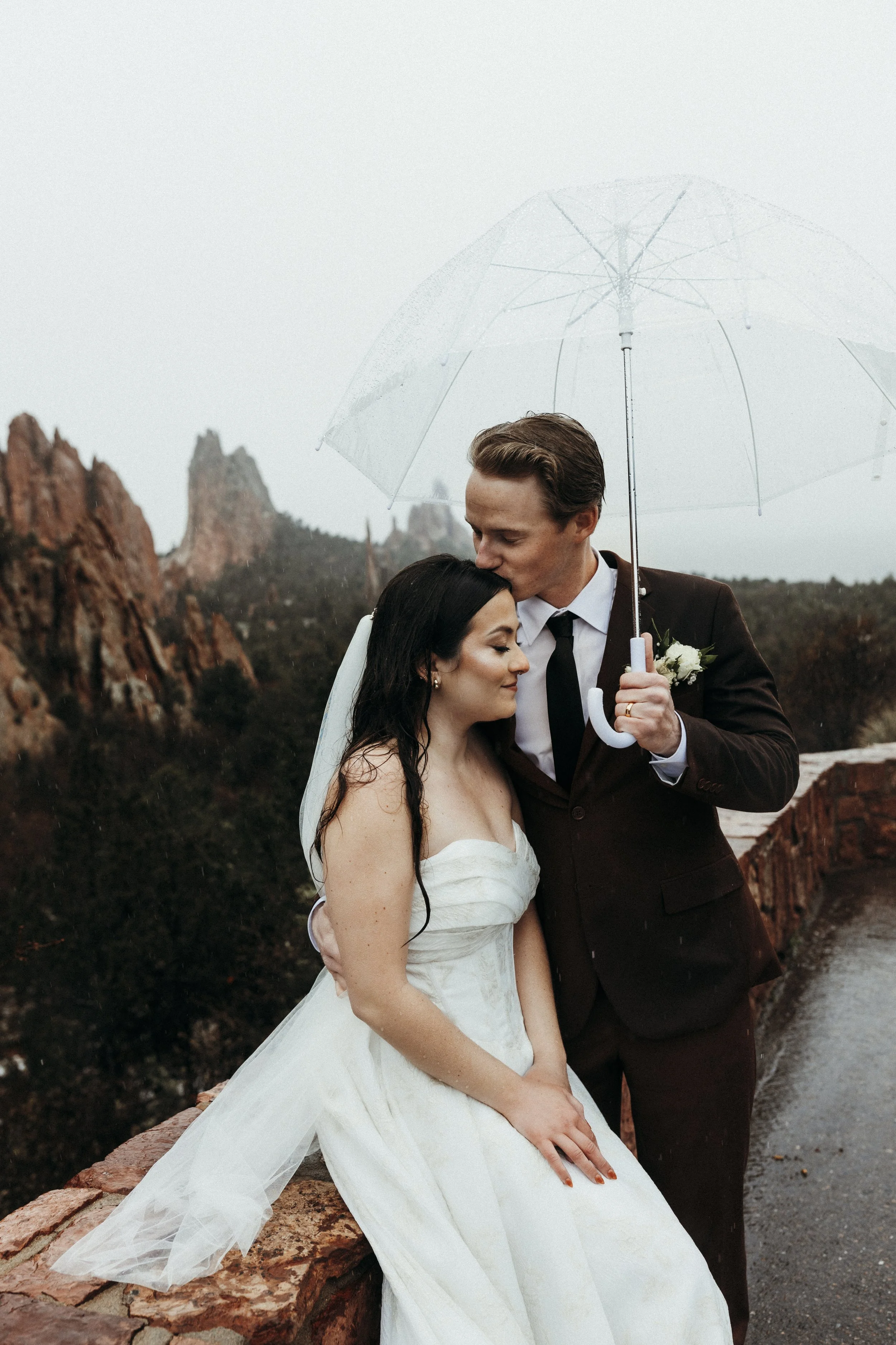Beth & Alec's rainy Garden of the God's elopement was, as Alec so eloquently put it: definitely memorable. I've shot in Colorado numerous times. I'm well aware of the vastly changing weather, and when I saw that the forecast called for rain and snow the afternoon of their ceremony, I was none too concerned. On a previous trip to Colorado I had inadvertently driven straight into a snow squall. A mere half hour later, while having a full break down in gas station parking lot, the weather was calm and clear. After that experience, not much frightened me, least of all some rain. So I packed my gear and headed up the mountain on that chilly day in May, thinking we would shoot between rain showers. Boy, was I wrong. When I arrived it was heavily snowing, and once the ceremony begin the snow changed over into a cold, moderate rainfall. While the rain did become lighter as the afternoon progressed, it never stopped raining. Not once. This elopement ended up producing one of the most challenging weather circumstances I've endured to date. And yet, the photos turned out so hauntingly lovely.