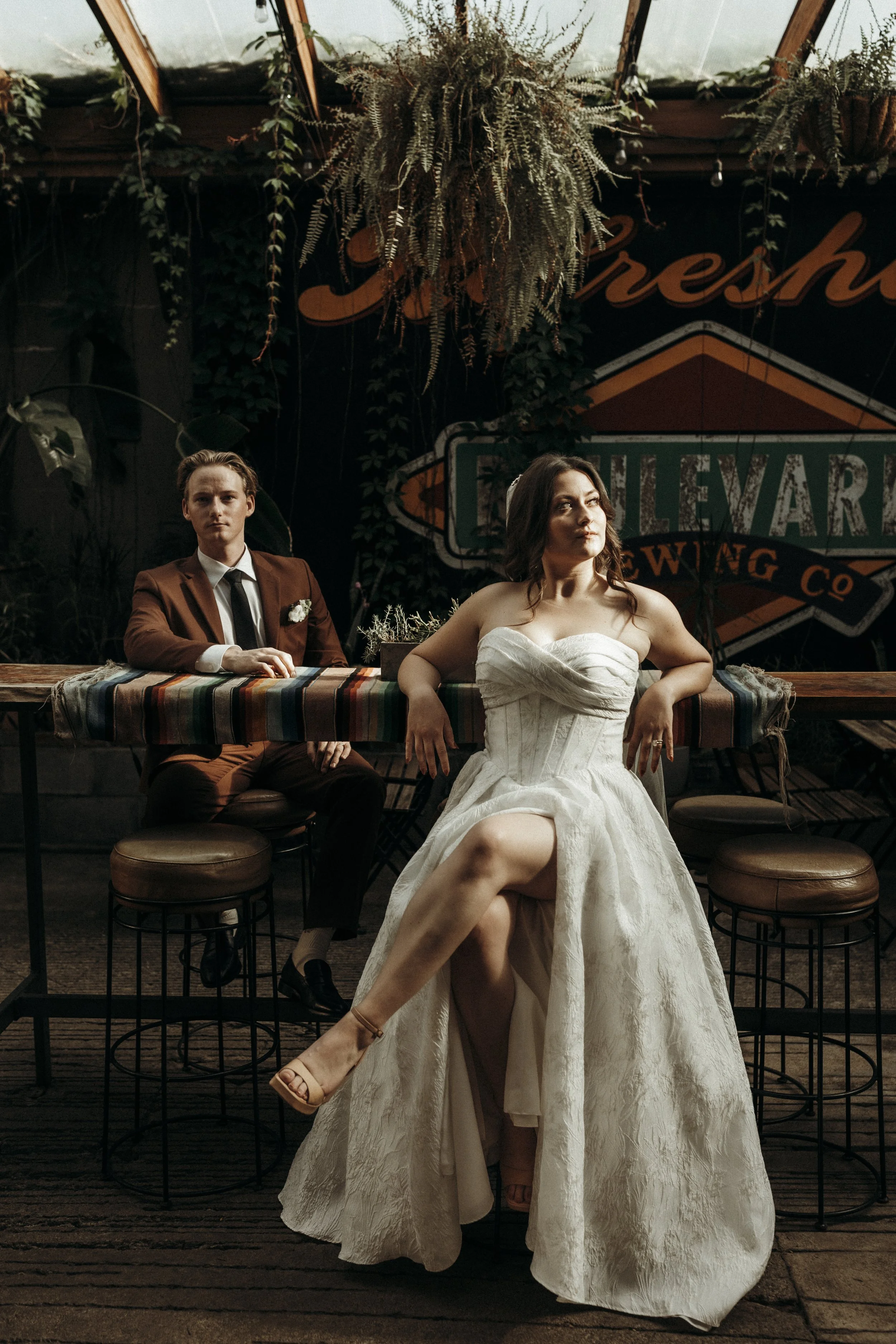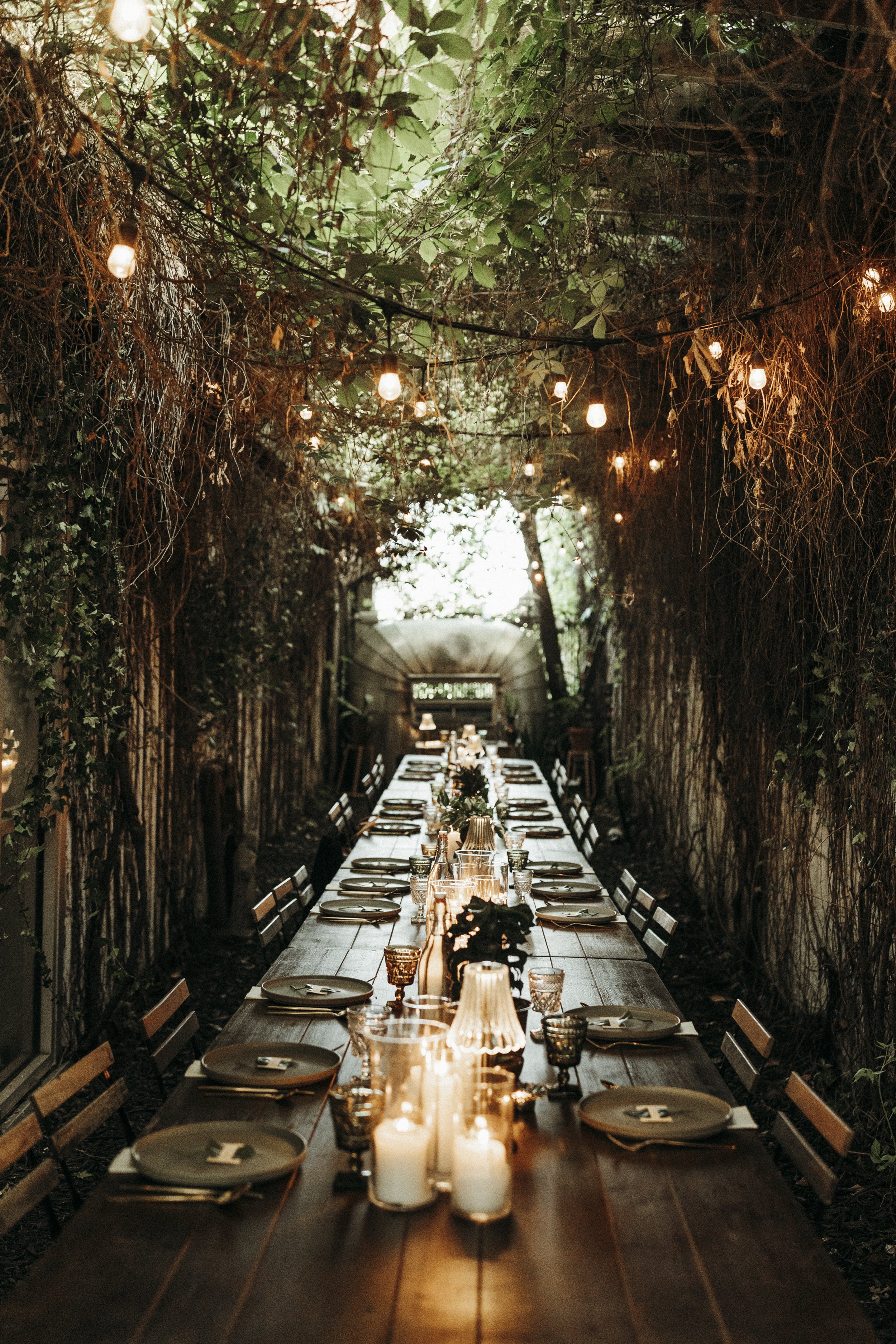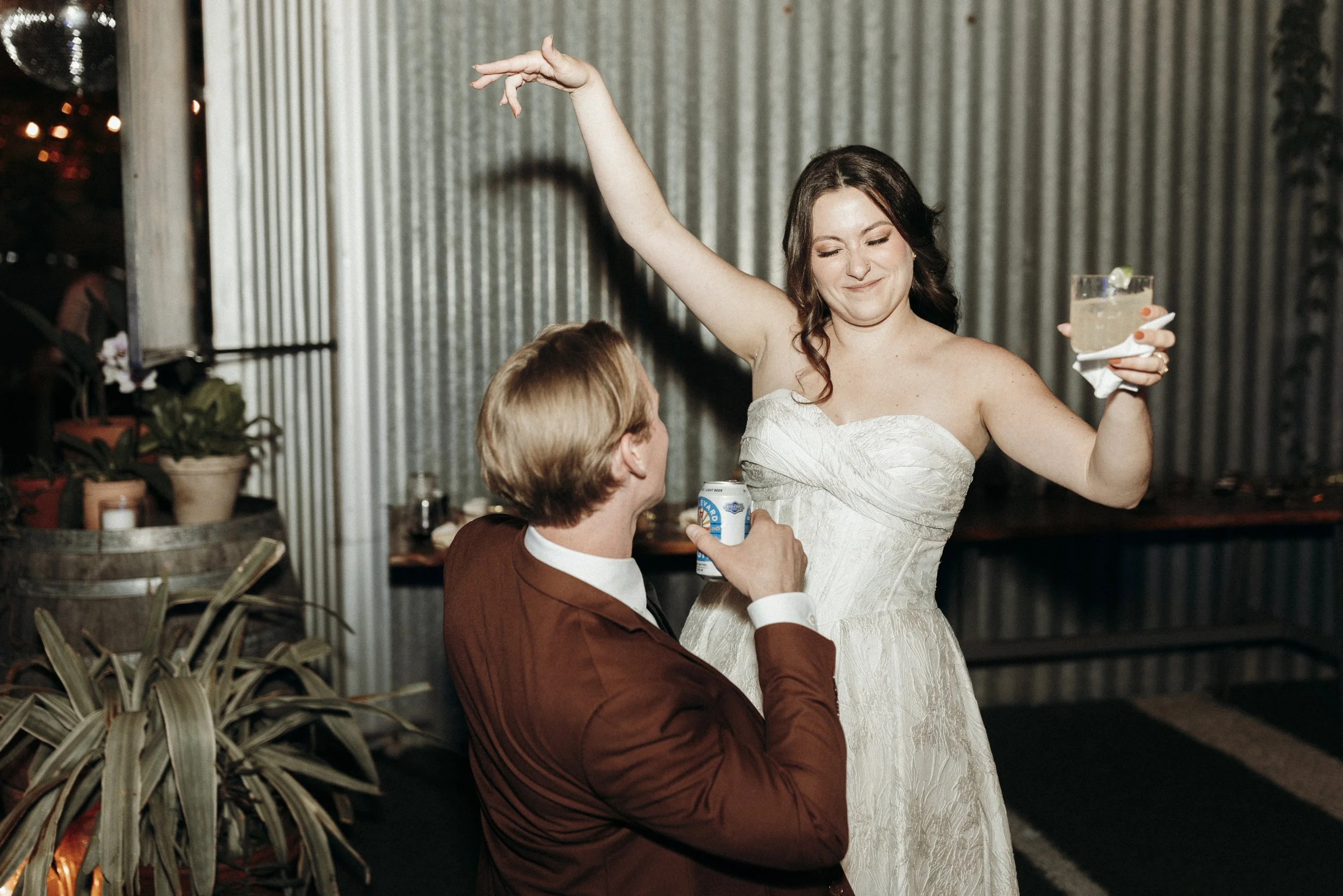 A mere three days later, on a (mockingly) sunny and warm day in Kansas City, we celebrated once again at Beth & Alec's reception. Their reception was as unique as their elopement, designed in a greenhouse space like I'd never seen. They rented out Panther's Place, an open air bar and greenhouse, and hosted a small dinner for family in a long covered alleyway draped in vines. After dinner, they invited friends to come out and celebrate as well with drinks, dancing, and dessert.
